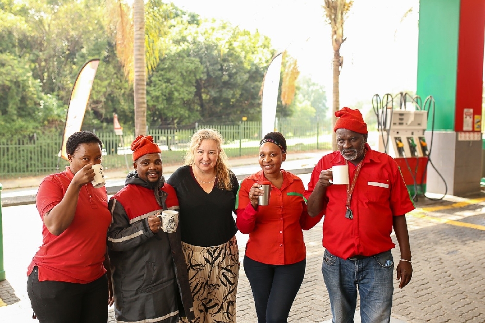 Caption: Dr Kerry Wilson (centre) shares a cup of Rooibos with petrol attendants participating